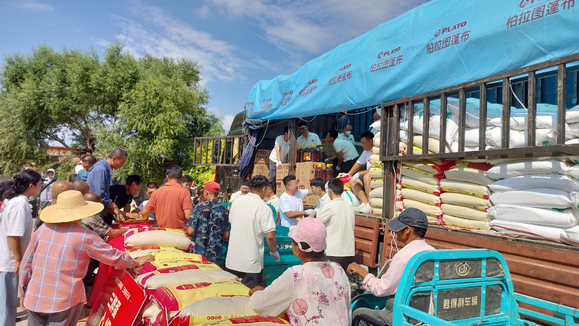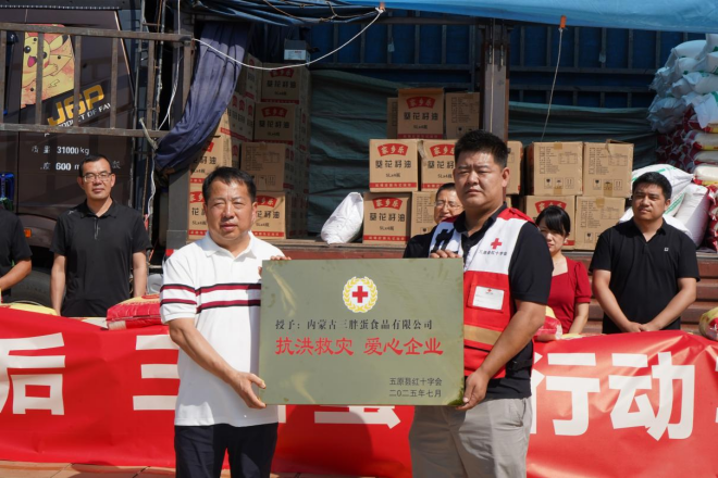 風雨突襲巴彥淖爾時,內(nèi)蒙古農(nóng)牧業(yè)產(chǎn)業(yè)化龍頭企業(yè)協(xié)會會長單位巴彥淖爾市三胖蛋食品有限公司與家鄉(xiāng)共赴暖陽,8月1日,三胖蛋公司開展“一戶不落”精準捐贈活動,為套海鎮(zhèn)和平村436戶受災(zāi)村民送去價值15萬元的米、面、油等生活物資。這個從河套平原走向全國的品牌,用行動詮釋著”家鄉(xiāng)人永遠和家鄉(xiāng)人站在一起“的質(zhì)樸承諾。